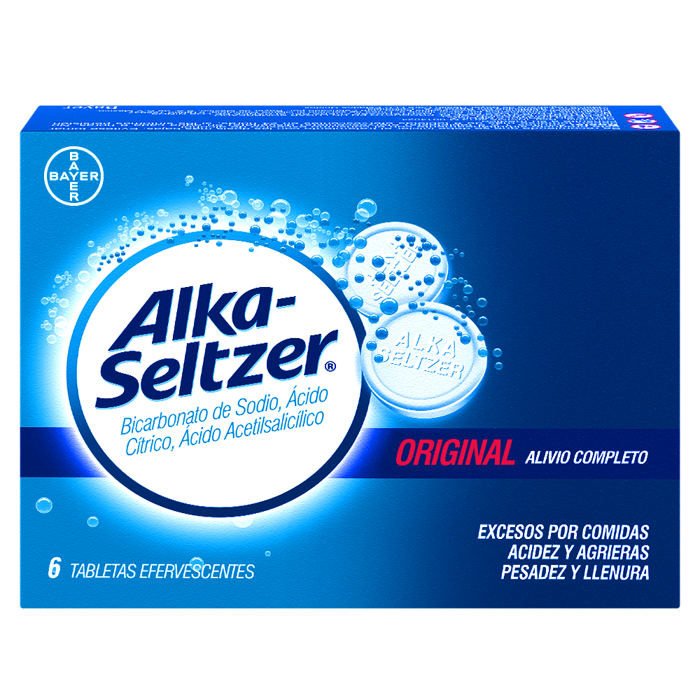 | Alka-Seltzer® Original Bicarbonato de sodio, Ácido Cítrico, Ácido Acetilsalicílico 6 Tabletas efervescentes Reg. San. INVIMA 2022M-0014024-R1 |